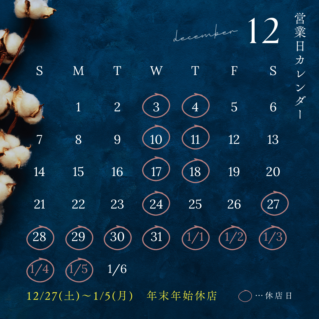 2025年12月~年末年始の営業カレンダー2025.11.20 2025年4月より、店舗は水曜・木曜・祝日が定休日に変更になっていますのでご注意ください。12/27(土)~1/5(月)年末年始休店になりますのでご注意ください。お歳暮受付中です。皆様のご来店お待ちしております! 2025年11月の営業カレンダー前の記事 2026年1月の営業カレンダー次の記事