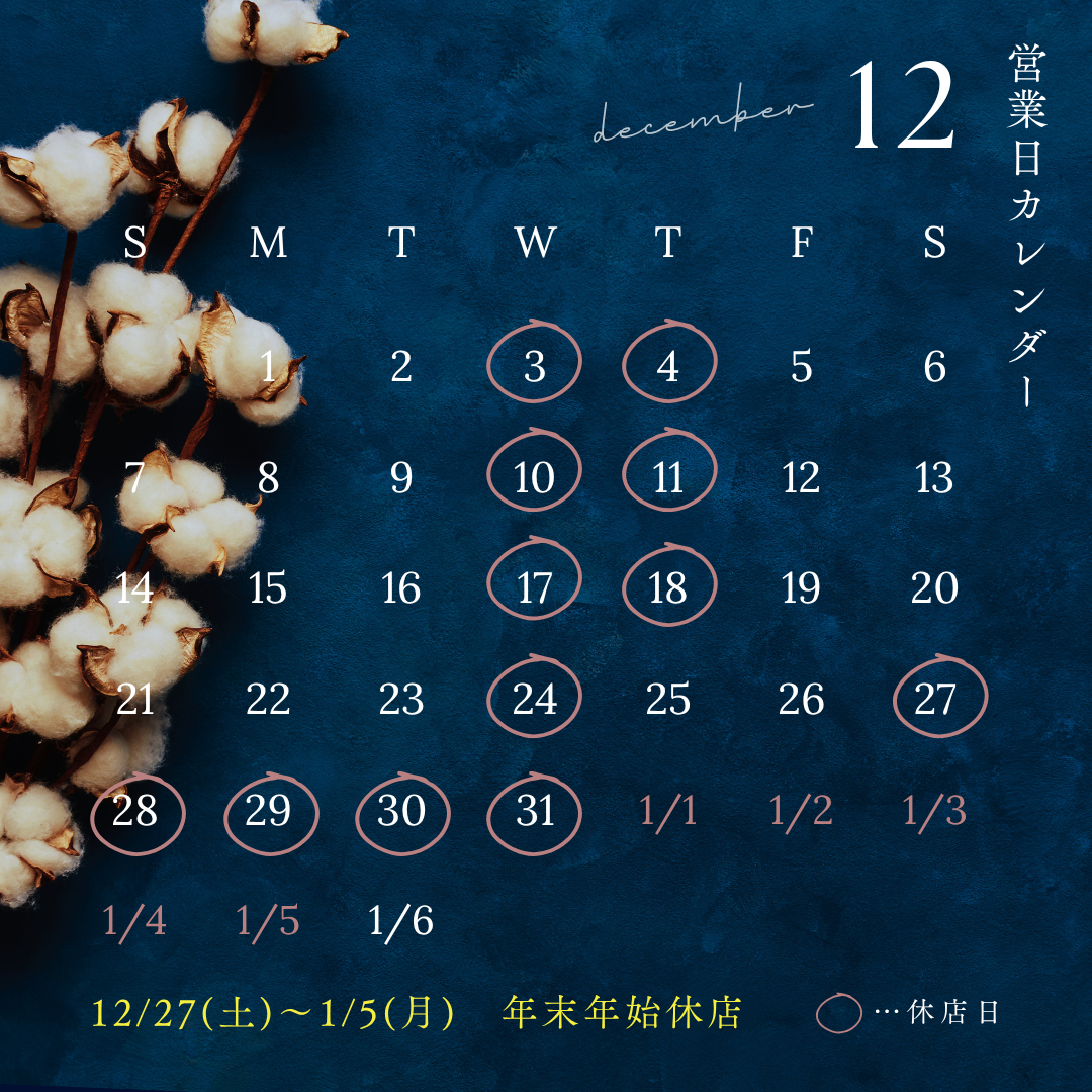 12/27(土)~1/5(月)年末年始休店になりますのでご注意ください。