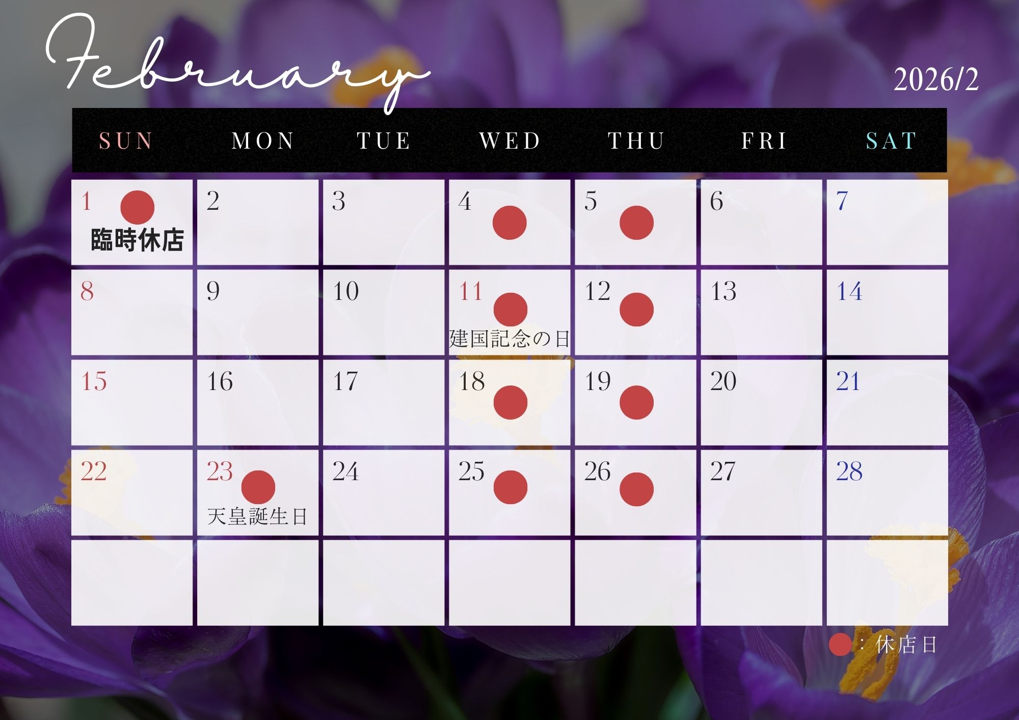 2026年2月の営業カレンダー※2/1臨時休店※2026.01.24 2025年4月より、店舗は水曜・木曜・祝日が定休日に変更になっていますのでご注意ください。2/1(日)は、店内設備の緊急メンテナンスのため 終日休店となります。 大変申し訳ございませんが何卒ご了承くださいますようお願いいたします。2/11(水)建国記念の日、2/23(月)天皇誕生日で休店です。皆様のご来店お待ちしております! 2026年1月の営業カレンダー前の記事