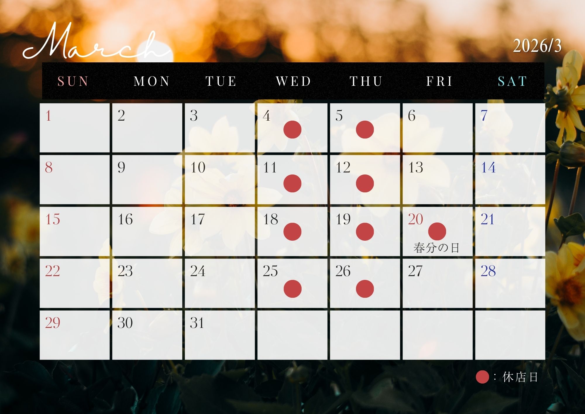 2026年3月の営業カレンダー2026.02.21 2025年4月より、店舗は水曜・木曜・祝日が定休日に変更になっていますのでご注意ください。3/20(金)春分の日で休店です。皆様のご来店お待ちしております! 2026年2月の営業カレンダー※2/1臨時休店※前の記事